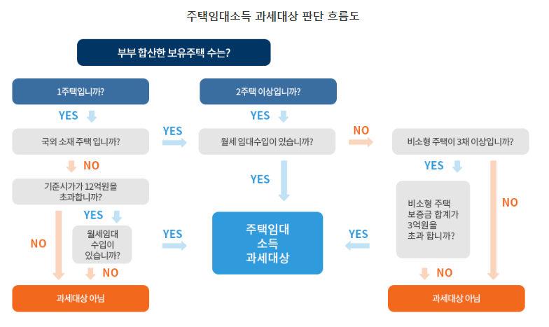 | 3주택 이상 | - 모든 월세 수입 - 소형주택이 아닌 주택을 3채 이상 보유하고 해당 보증금과 전세금을 합쳐 3억 원을 초과하는 경우에는 해당 보증금과 전세금이 과세대상 |